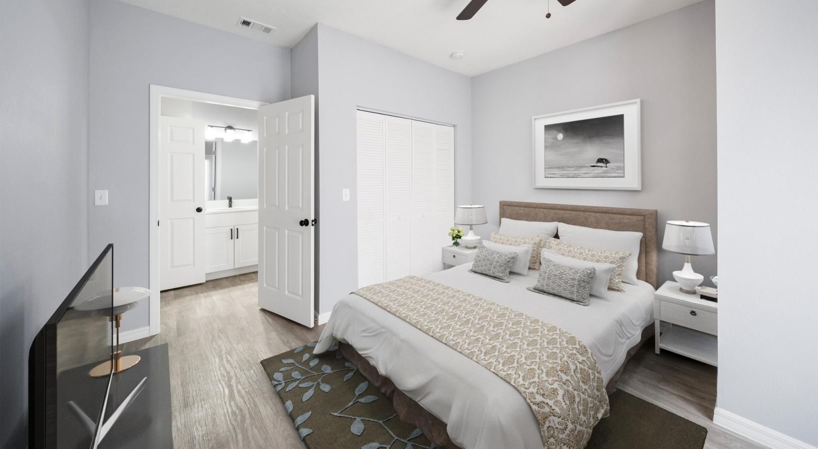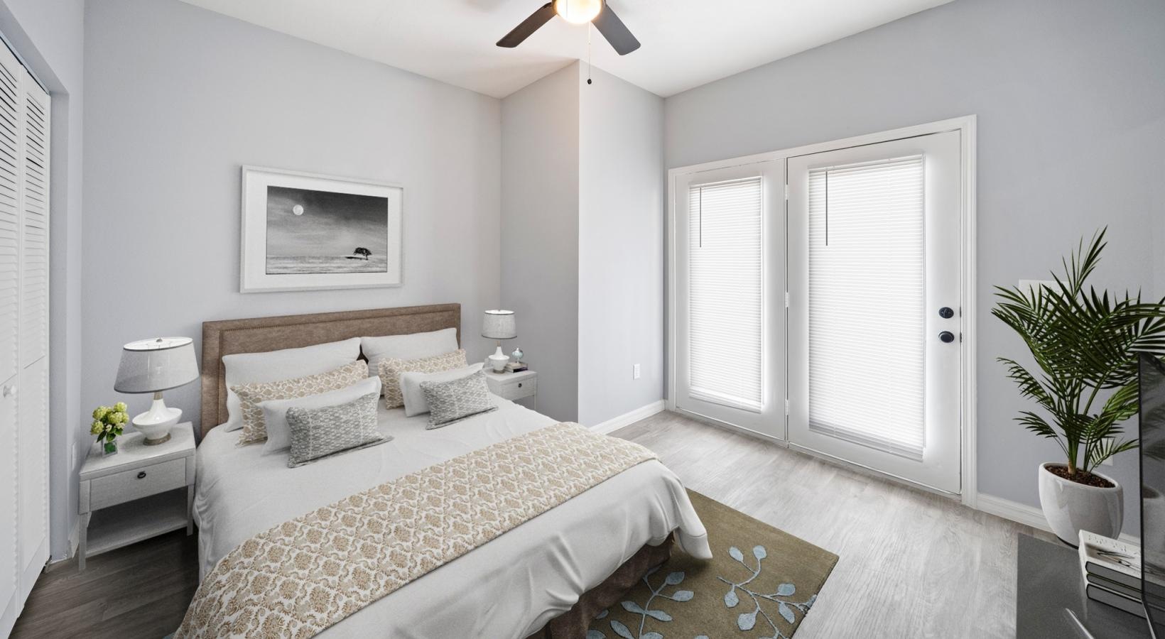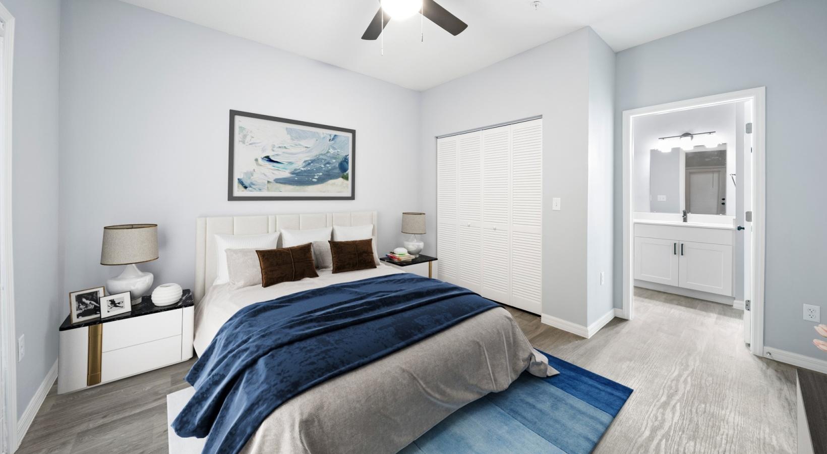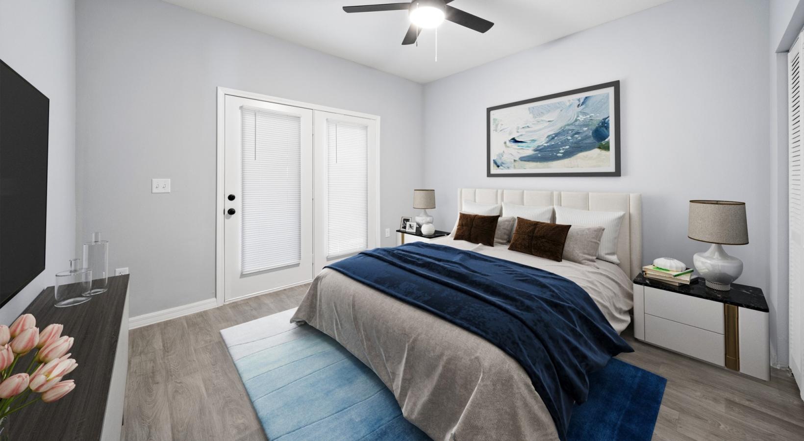 • a bedroom with a ceiling fan and a bed