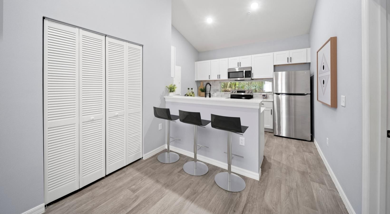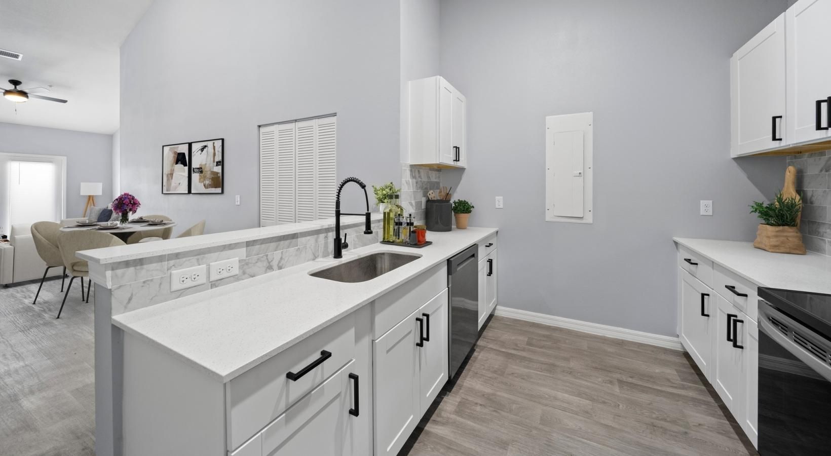 • a kitchen with white cabinets