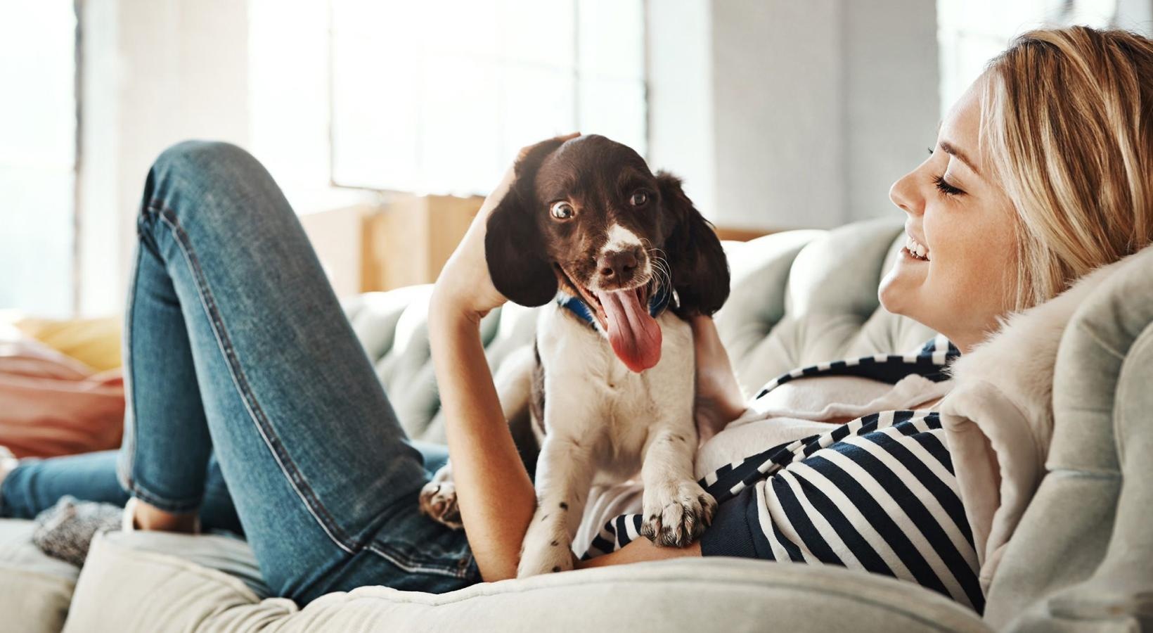 • woman lies on a couch and pets her dog